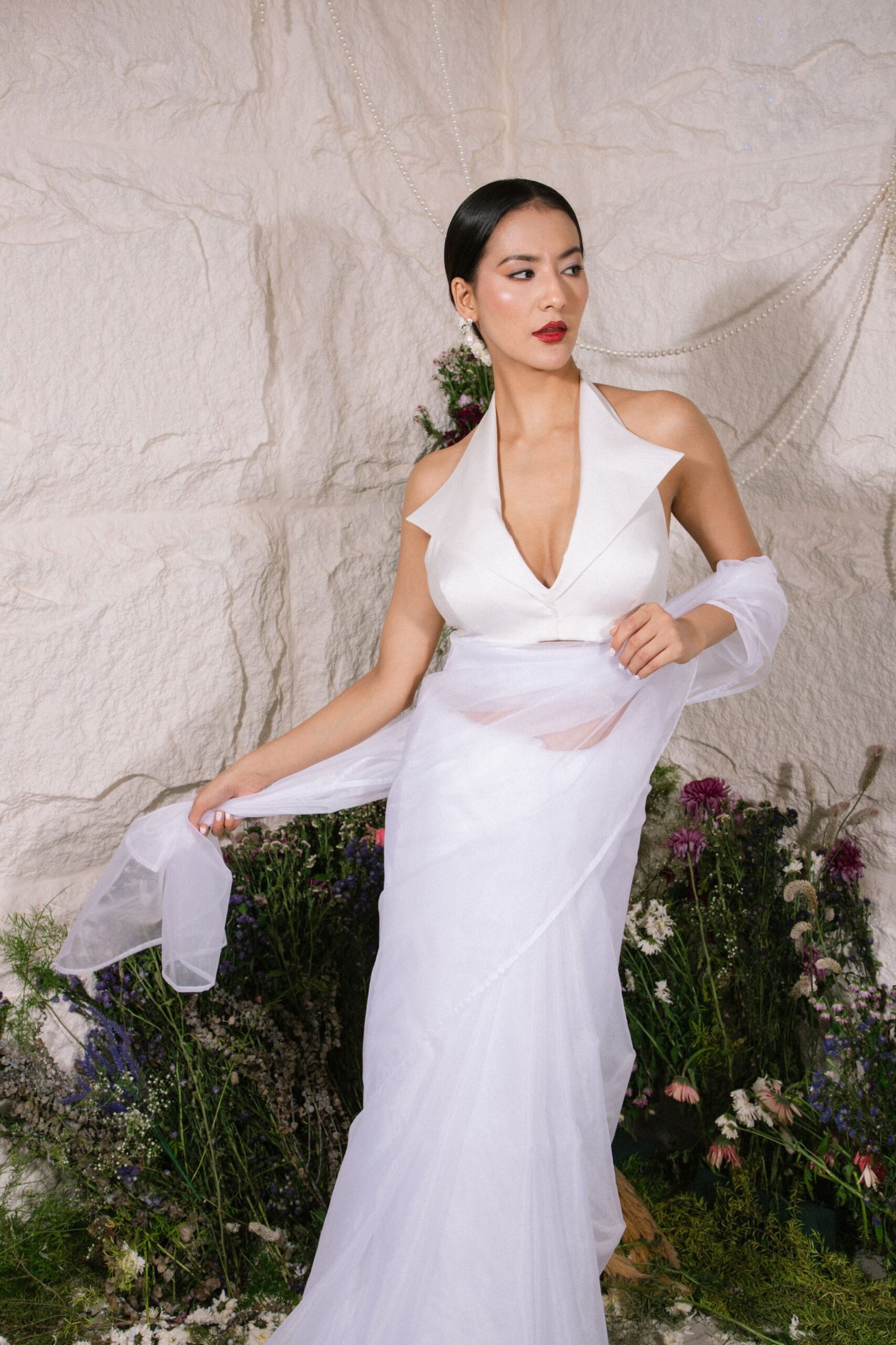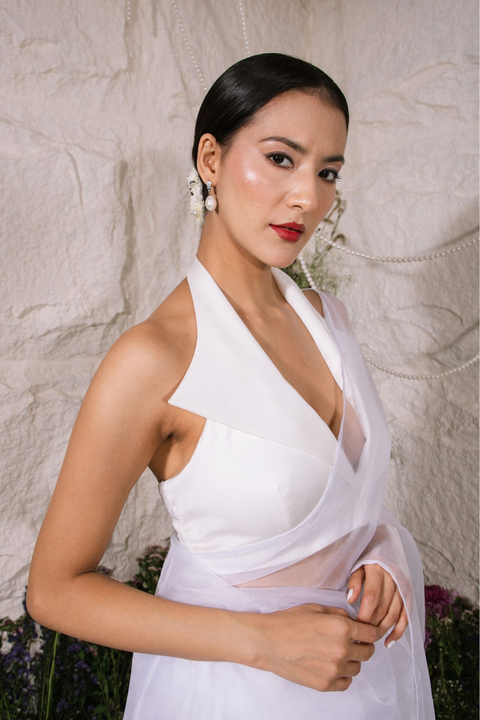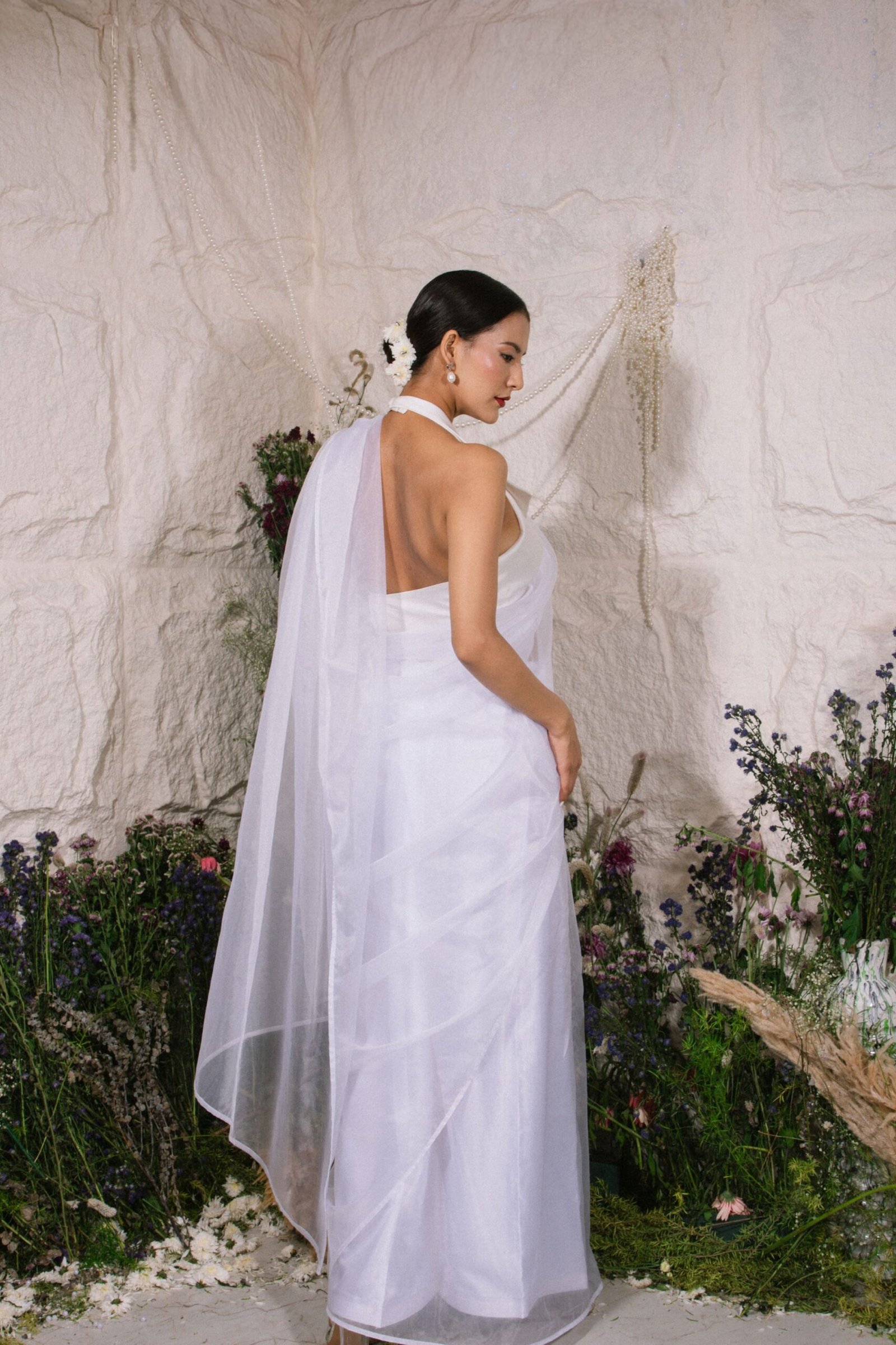 Ethereal and timeless — this white organza saree embodies effortless grace. Delicately crafted with sheer elegance and subtle sheen, it drapes like a whisper of light, perfect for occasions that call for quiet sophistication and enduring charm with satin collared blouse top.