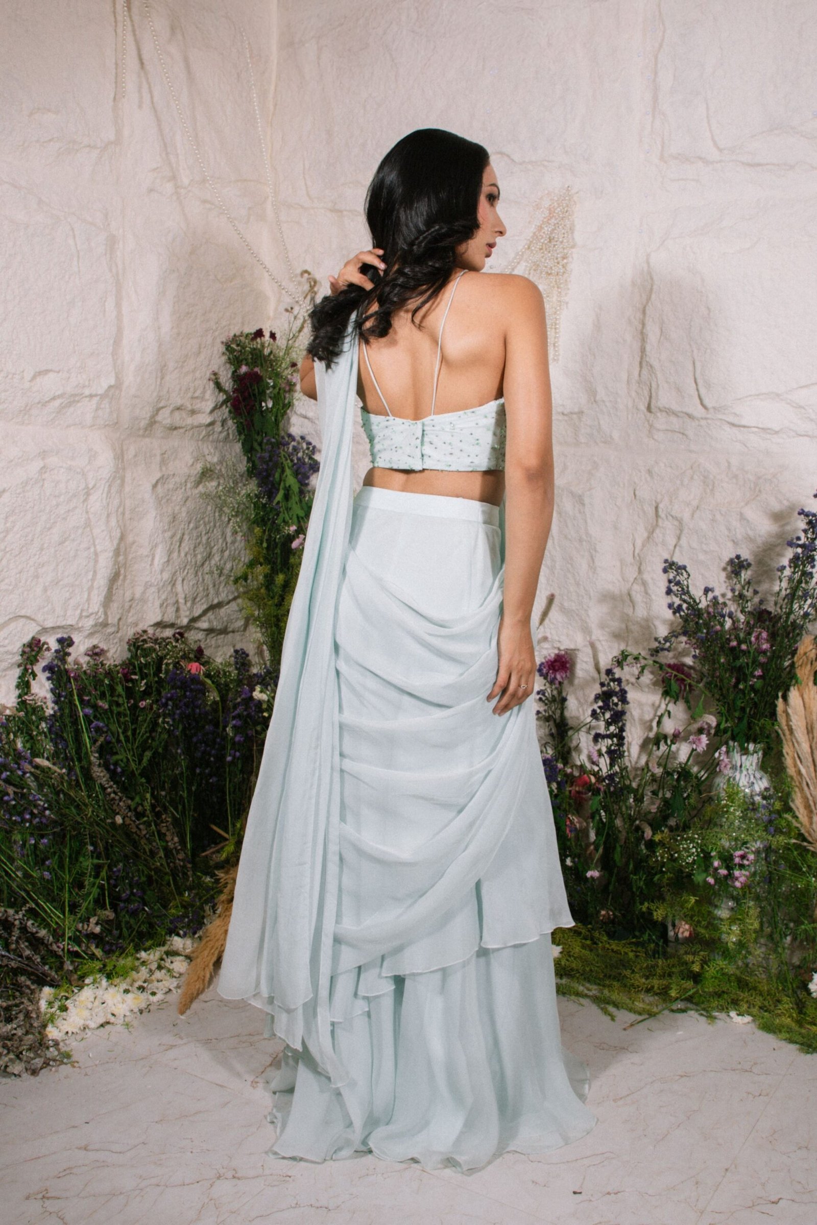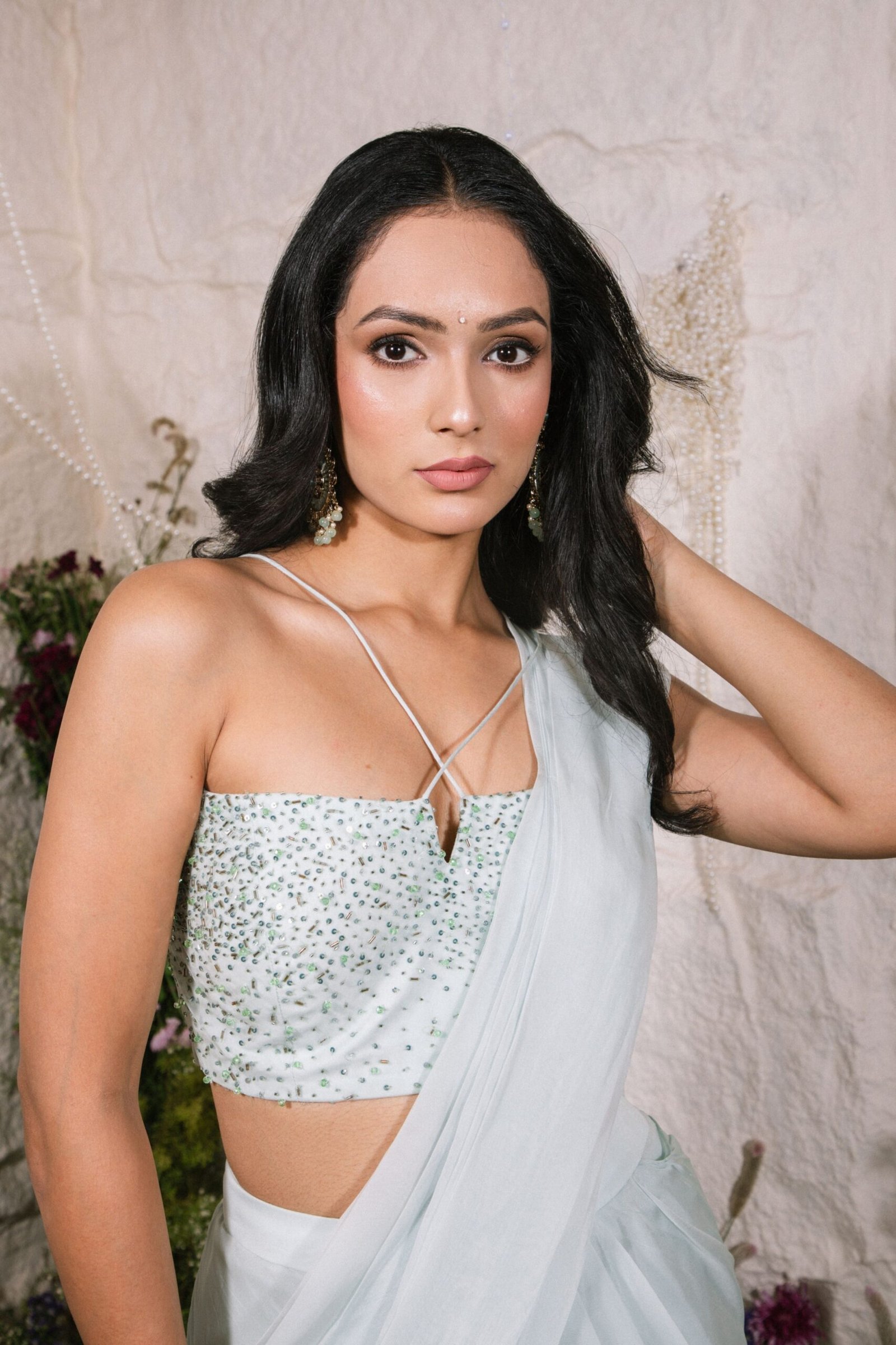 Effortless and alluring — this black organza drape saree embodies modern elegance with timeless charm. Paired with a beautifully hand embroidered blouse, it flows with ease and sophistication, making it perfect for evenings that call for quiet glamour and confident grace.