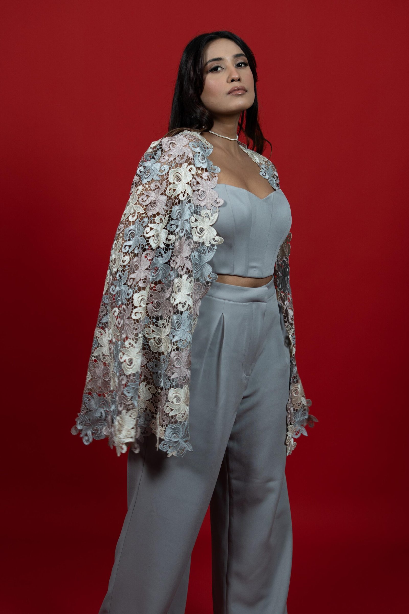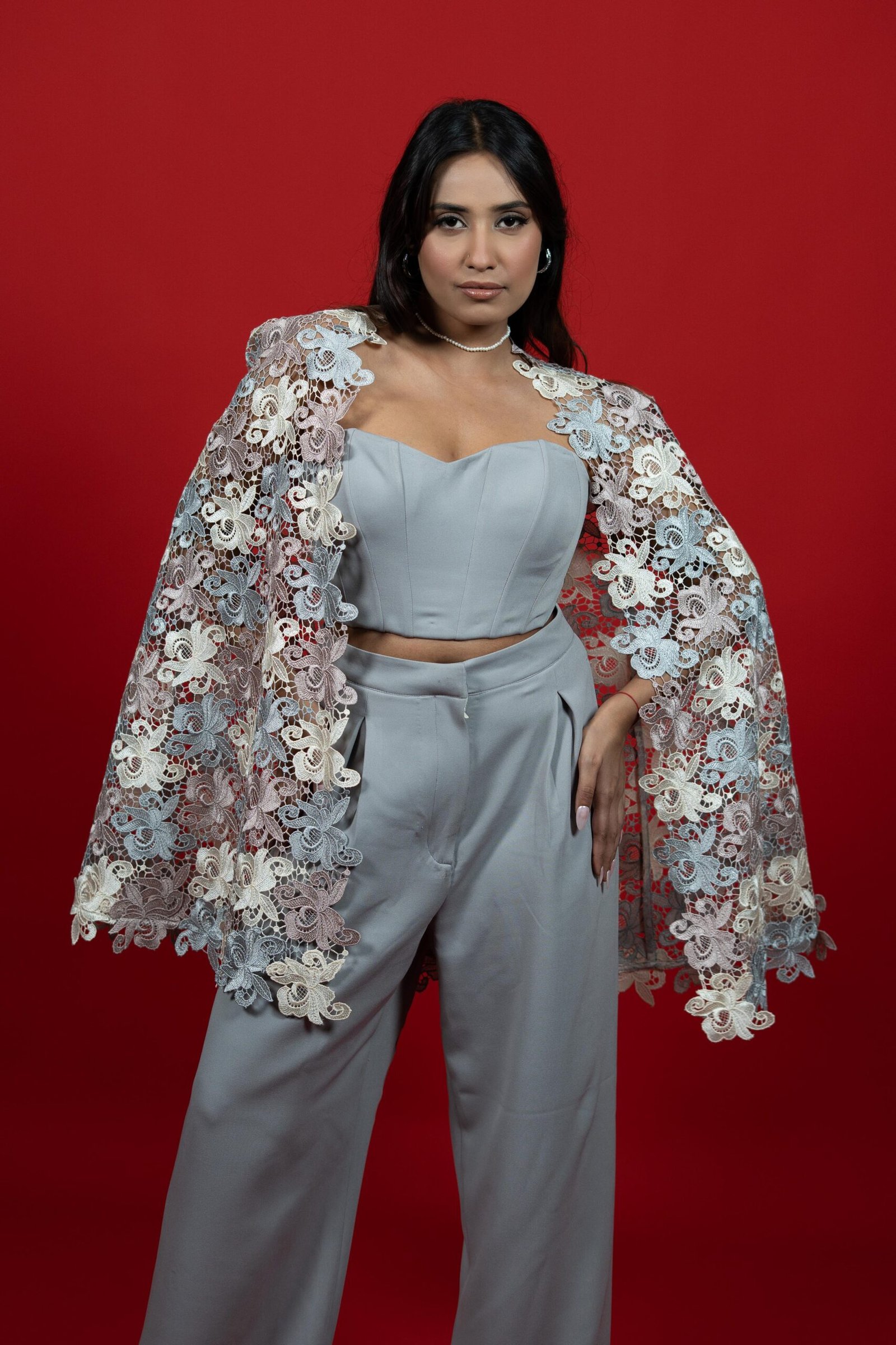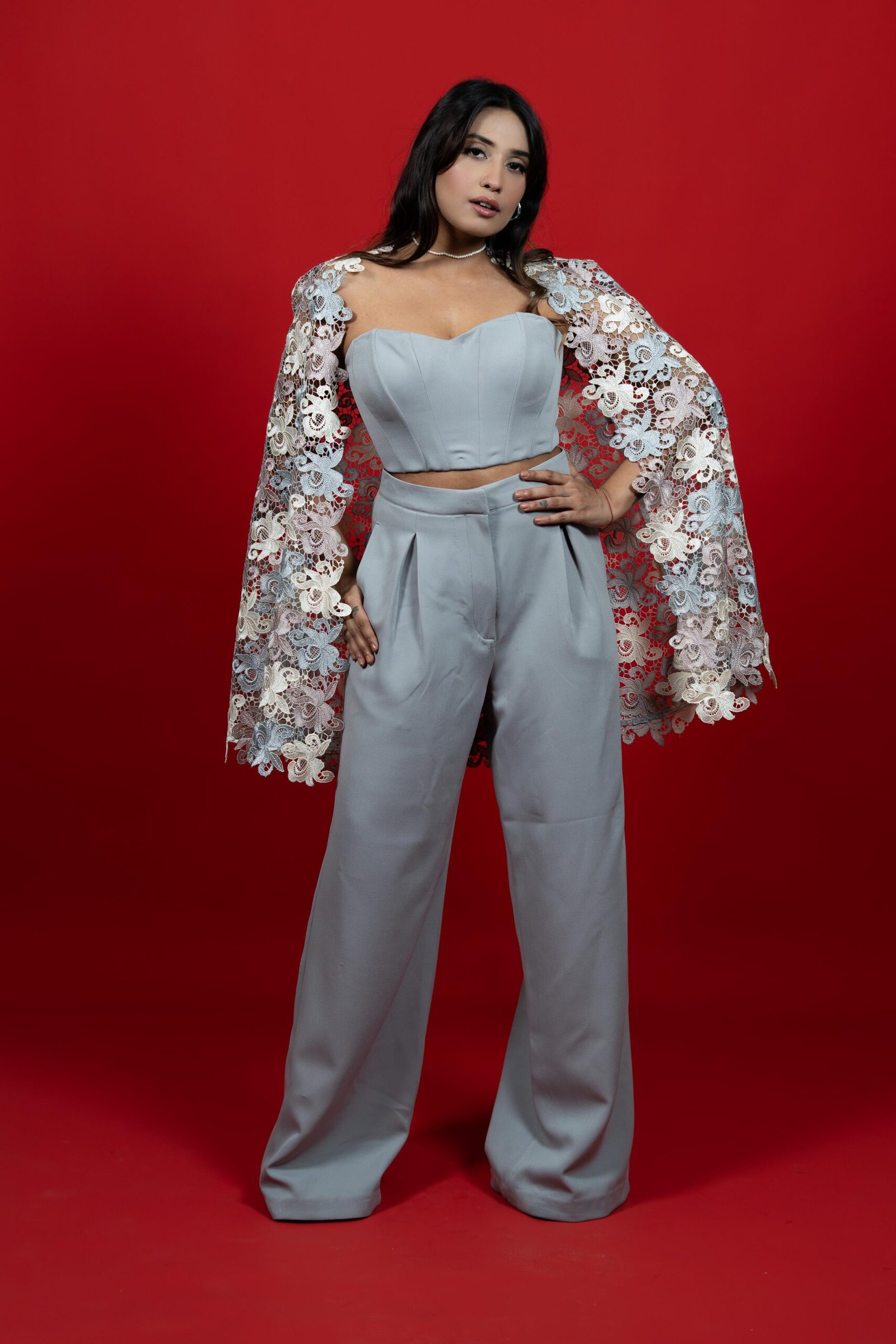 This structured crepe corset pairs with tailored pants and a statement cape, creating a bold silhouette that balances strength and sophistication. Fluid yet defined, it’s made for those who lead with presence—and dress like they mean it.